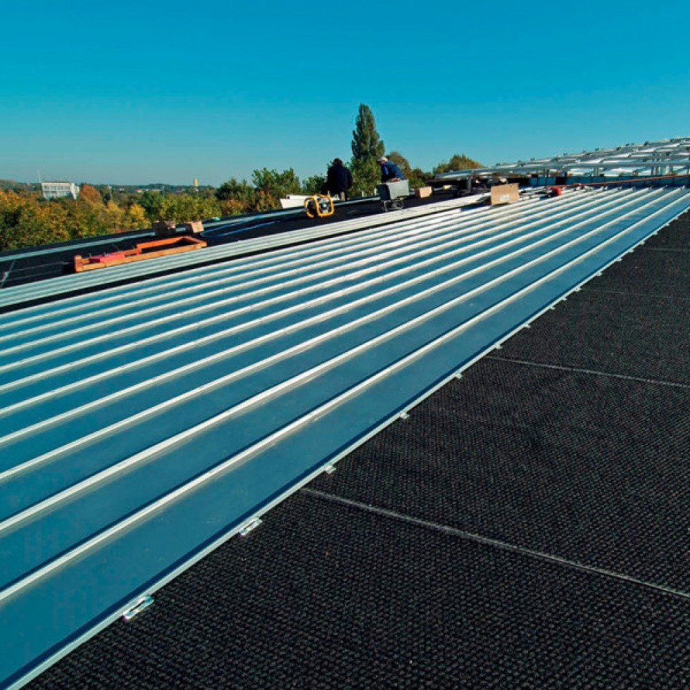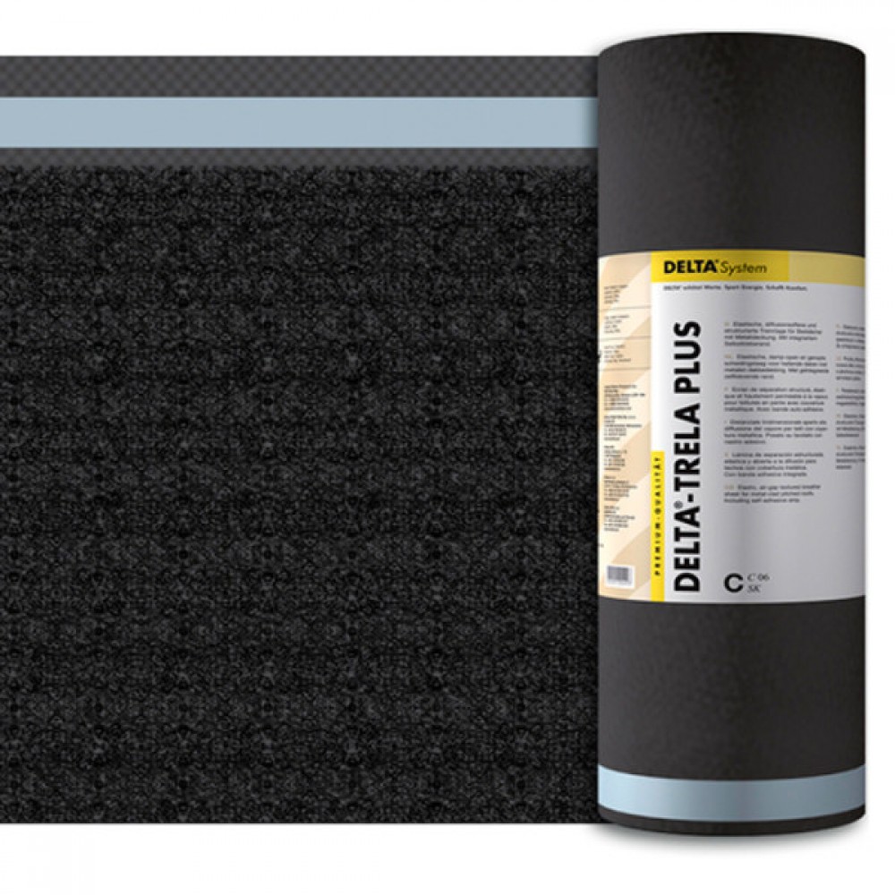 DELTA®-TRELA PLUS объёмная диффузионная мембрана/структурированная разделительная прослойка (ОДМ) используется с металлическими фальцевыми и штучными кровлями (из стали, меди, цинка, алюминия) и с фасадами, облицованными металлом. Обеспечивает скольжение металла при температурных деформациях. Трёхмерная структура высотой 8 мм из ориентированных волокон препятствует образованию конденсационной влаги на нижней стороне металлической кровли. Благодаря постоянному отводу конденсата мембрана эффективно защищает кровлю от коррозии.
