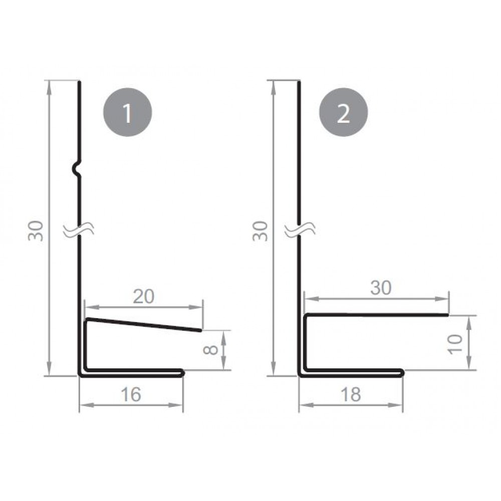 F-профиль AQUASYSTEM Pe-полиэстер (Zn 140) применяется в случае отсутствия направляющего бруска, крепится на стену с помощью саморезов. В паз F-профиля устанавливается софит.