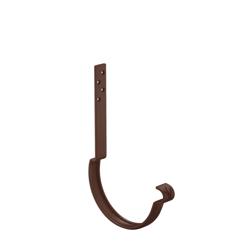 Крюк крепления желоба длинный AQUASYSTEM, L=140мм, D150/100 мм, PURAL MATT RAL 8017 предназначен для крепления водосточного желоба и обеспечения его необходимого уклона для движения воды в необходимом направлении. Крюк изготовлен из цельнометаллической стали толщиной 4 мм и имеет дополнительное ребро жесткости. Установка осуществляется на верхнюю плоскость стропил или плоскость сплошного основания до момента укладки кровельного покрытия. Данный вид установки позволяет водосточной системе выдерживать большие силовые нагрузки.
