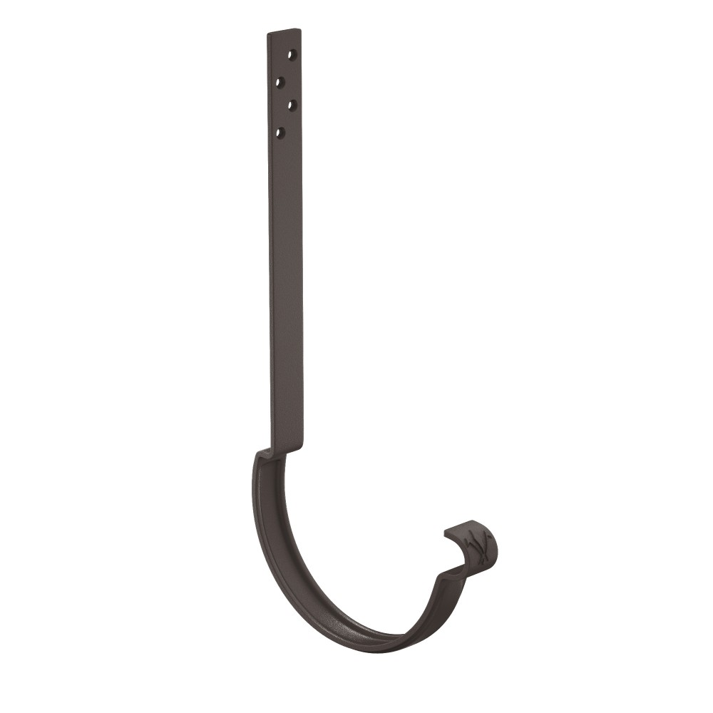 Крюк крепления желоба удлиненный AQUASYSTEM, L=220мм, D150/100 мм, PURAL MATT RR 32 предназначен для крепления водосточного желоба и обеспечения его необходимого уклона для движения воды в необходимом направлении. Крюк изготовлен из цельнометаллической стали толщиной 4 мм и имеет дополнительное ребро жесткости. Поставляется с комплектом креплений. Устанавливается по аналогии с длинным крюком на верхнюю плоскость стропил или плоскость сплошного основания до момента укладки кровельного покрытия. Удлиненный крюк крепления желоба применяется в тех случаях, когда длинного крюка из-за особенностей кровли не хватает. Данный вид установки позволяет водосточной системе выдерживать большие силовые нагрузки.