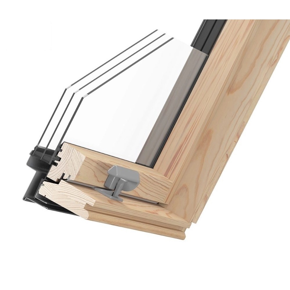 Мансардное окно DAKEA KAV P6A B1500 с двухкамерным стеклопакетом, изготовлено из ламинированной сосны камерной сушки (защита от насекомых, двухслойный лак на водной основе). Открывается по центральной оси, ручка расположена на нижней части рамы. Ручка с возможностью установки окна в режим проветривания. Вентиляционный клапан, встроенный в верхнюю часть рамы, позволяет проветривать помещение при закрытом окне. Накладки - алюминий, цвет RAL 7043.