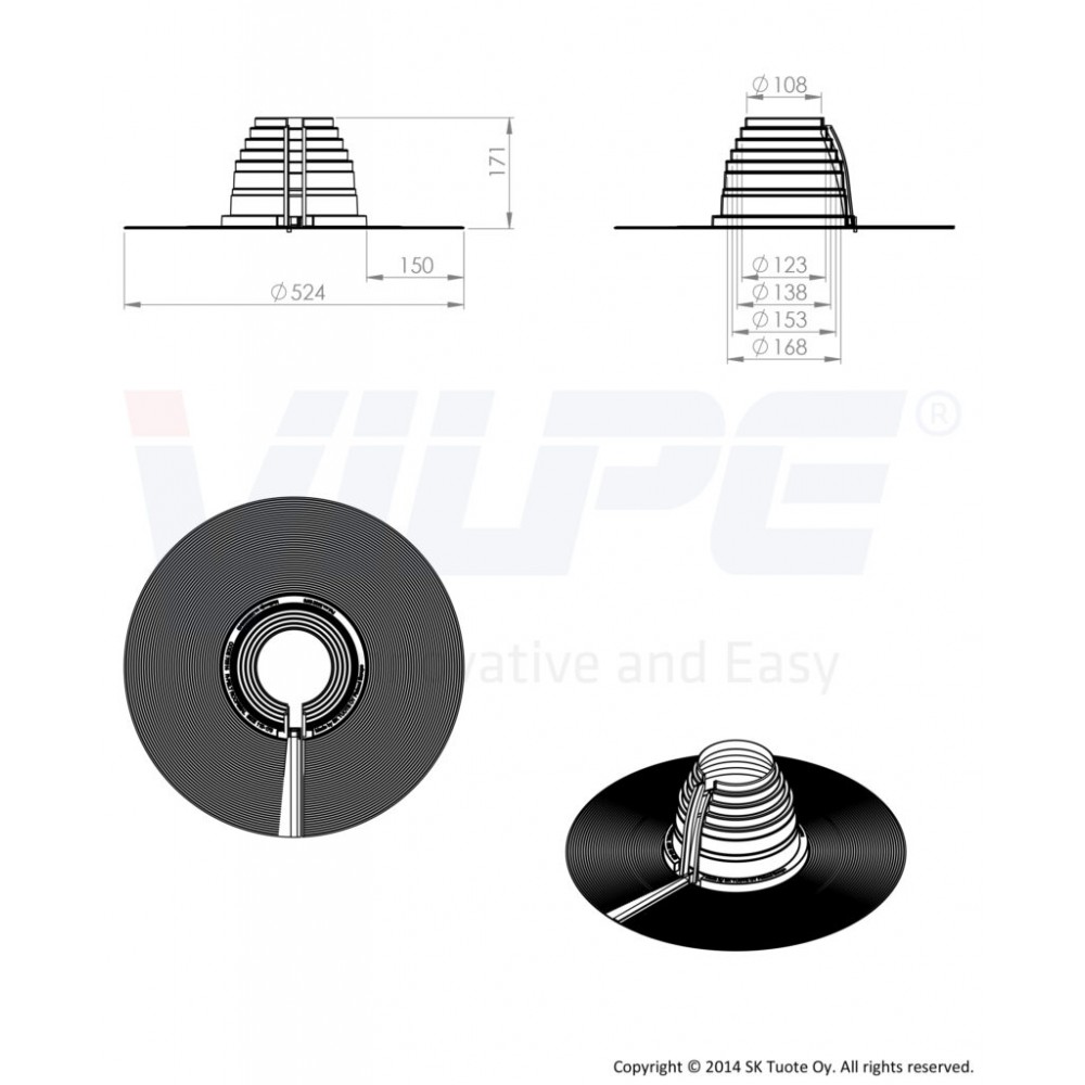 Разъемный резиновый уплотнитель VILPE R-FELT Ø 110-170 мм предназначен для герметизации примыканий объектов, уплотнение которых невозможно неразъемными уплотнителями. Уплотнители рекомендуется использовать на плоских кровлях (уклон < 11,5°). Шов уплотнителя имеет клейкое покрытие, защищенное лентой от пыли и грязи. Вертикальная часть шва укрепляется алюминиевым зажимом. Шов на фланце уплотнителя плоский, что улучшает герметичность соединения фланца с кровельным материалом.