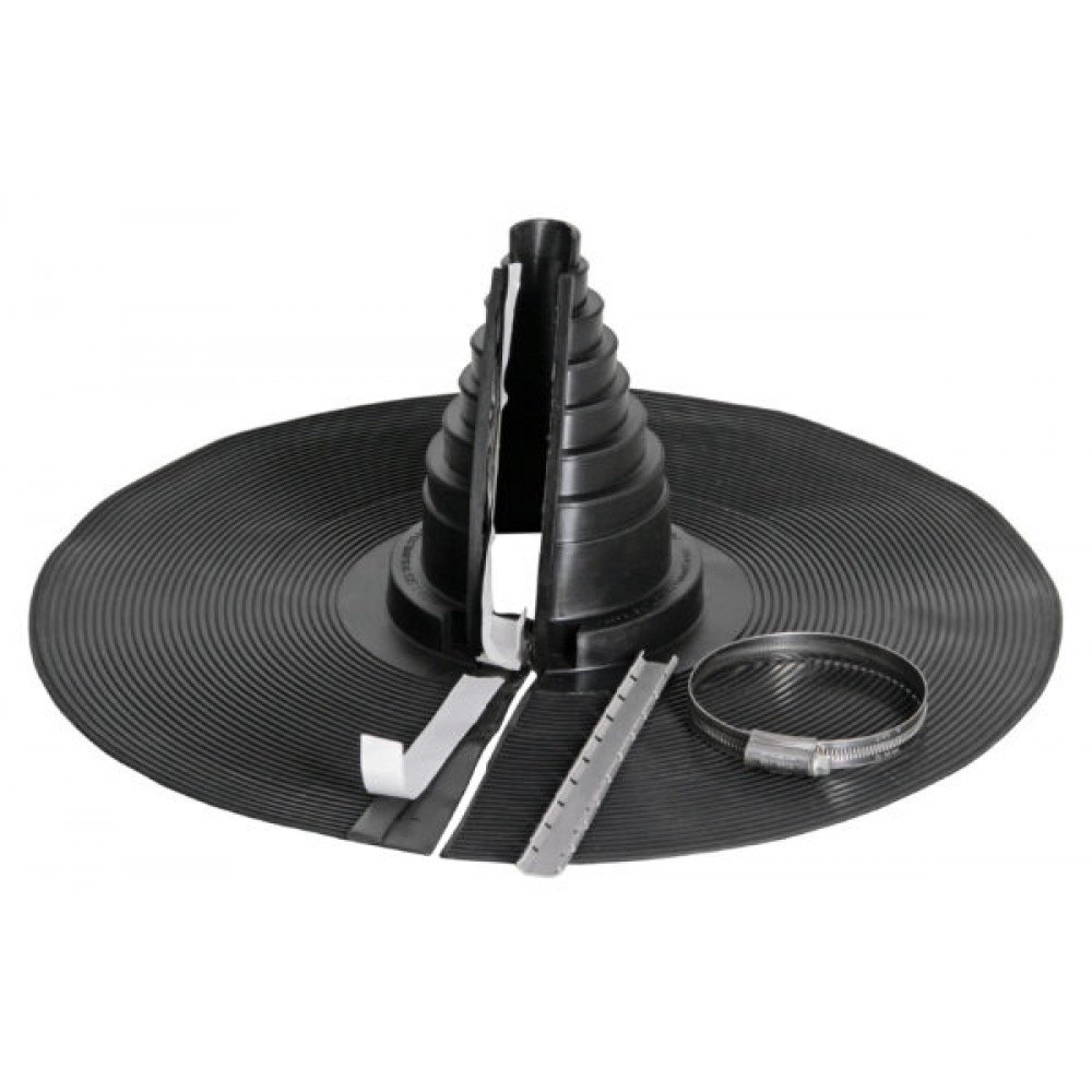 Гибкий уплотнитель из EPDM-резины допускает тепловые и механические колебания, герметизируя отверстие в кровле. Запатентованное рифление и специальная обработка фланца обеспечивают надежное соединение с битумным материалом и максимально большую площадь поверхности уплотнения. Ширина фланца 150 мм соответствует Европейским строительным нормам.