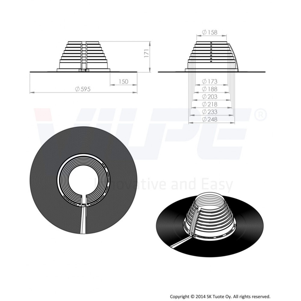 Разъемный резиновый уплотнитель VILPE R-FELT Ø 160-250 мм предназначен для герметизации примыканий объектов, уплотнение которых невозможно неразъемными уплотнителями. Уплотнители рекомендуется использовать на плоских кровлях (уклон < 11,5°). Шов уплотнителя имеет клейкое покрытие, защищенное лентой от пыли и грязи. Вертикальная часть шва укрепляется алюминиевым зажимом. Шов на фланце уплотнителя плоский, что улучшает герметичность соединения фланца с кровельным материалом.