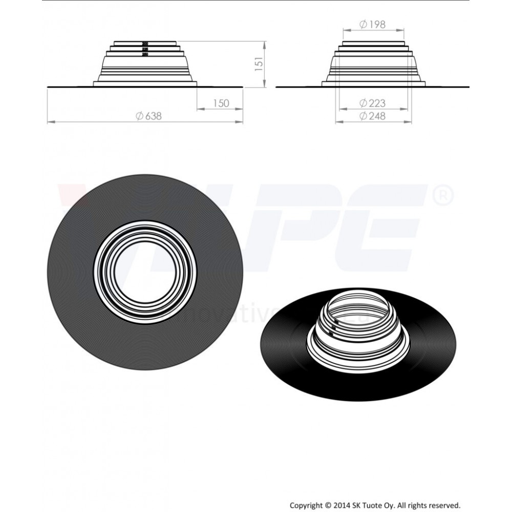Резиновый уплотнитель VILPE FELT-ROOFSEAL No6 Ø 200-250 мм предназначен для герметичной проводки труб, опор рекламных щитов, флагштоков, кабелей и т.д. через битумную кровлю. Гибкий уплотнитель из EPDM-резины допускает тепловые и механические колебания, герметизируя отверстие в кровле. Запатентованное рифление и специальная обработка фланца обеспечивают надежное соединение с битумным материалом и максимально большую площадь поверхности уплотнения. Ширина фланца 150 мм соответствует Европейским строительным нормам. Комплектуются металлическими хомутами STAINLESS. Уплотнители рекомендуется использовать на плоских кровлях (уклон < 11,5°).