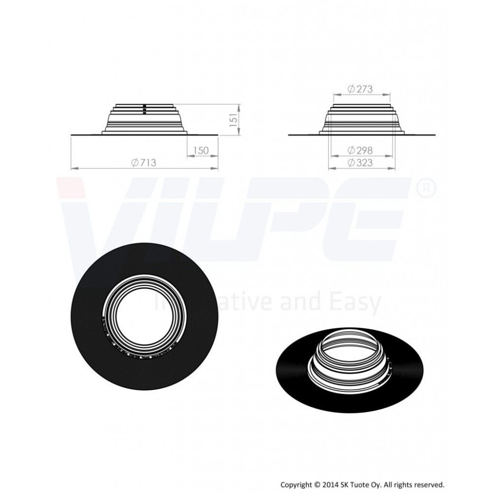 Резиновый уплотнитель VILPE FELT-ROOFSEAL No7 Ø 275-325 мм предназначен для герметичной проводки труб, опор рекламных щитов, флагштоков, кабелей и т.д. через битумную кровлю. Гибкий уплотнитель из EPDM-резины допускает тепловые и механические колебания, герметизируя отверстие в кровле. Запатентованное рифление и специальная обработка фланца обеспечивают надежное соединение с битумным материалом и максимально большую площадь поверхности уплотнения. Ширина фланца 150 мм соответствует Европейским строительным нормам. Комплектуются металлическими хомутами STAINLESS. Уплотнители рекомендуется использовать на плоских кровлях (уклон < 11,5°).