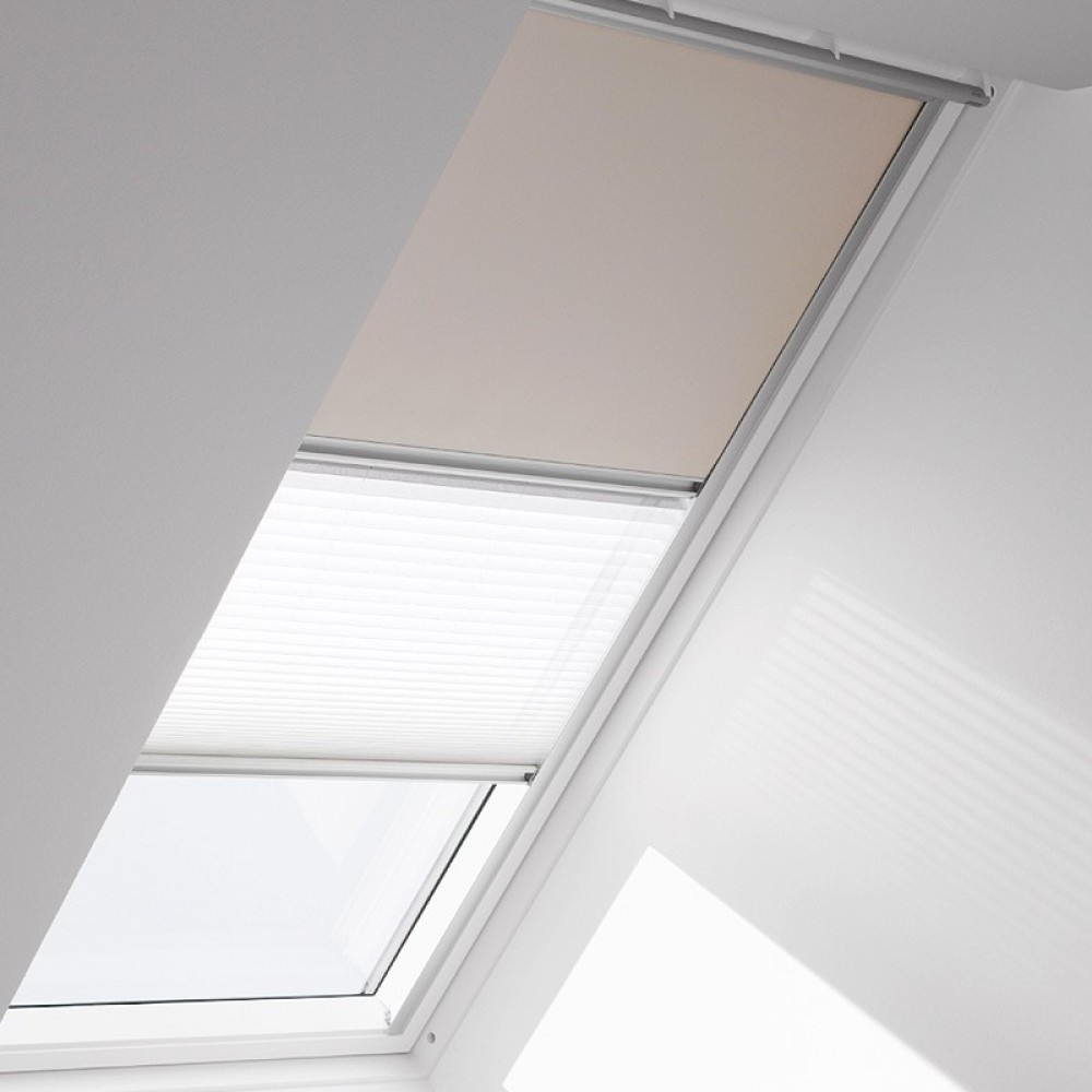 Штора затемняющая "Дуо" VELUX DFD CK04 1085S – функциональная и удобная в использовании модель сочетает затемняющую штору "Сиеста" и штору-плиссе белого цвета. Затемняющая штора и штора-плиссе оборудована отдельной ручкой-планкой, что позволяет контролировать количество проникающего и рассеиваемого света. Шторы плавно передвигается по направляющим, и могут быть зафиксированы в любом положении на мансардном окне. Для высоко расположенных штор можно воспользоваться специальным стержнем.