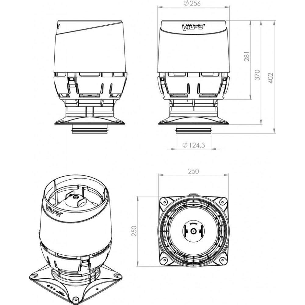 Технические характеристики Вентиляционный выход VILPE FLOW 125S с основанием 250x250 для монтажа на шахту, RR 23 – серый графит