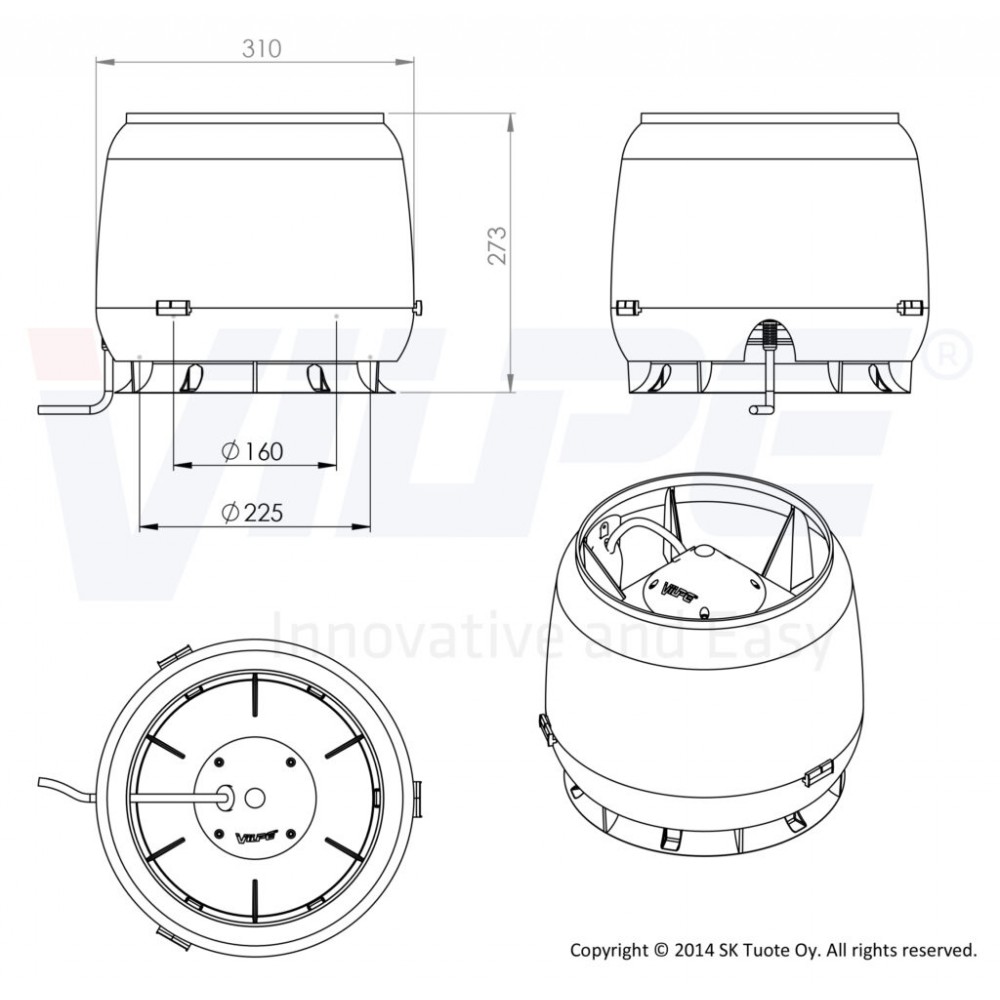 Вентиляторы VILPE S-серии представляют собой колпак-дефлектор, оснащенный двигателем. Основание Е220S 300 х 300 мм входит в комплект.