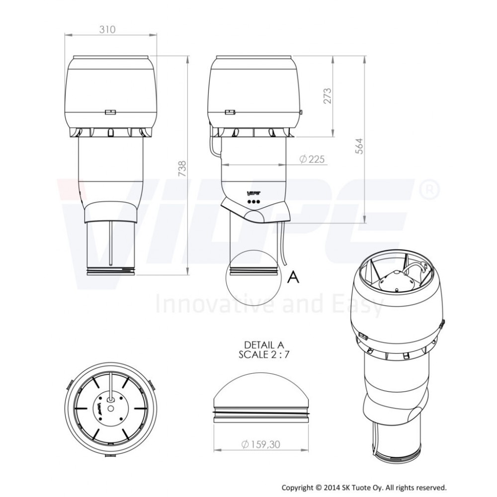 Вентилятор представляет собой трубу с колпаком, в который встроен вентилятор. Труба теплоизолирована для предотвращения образования конденсата в трубе. Внутренняя труба изготовлена из перфорированной оцинкованной стали и имеет теплоизоляцию толщиной 50 мм. Длина внутренней трубы позволяет вставить ее в подводимый воздуховод на длину 300 мм. Это облегчает вертикальный монтаж в тесных чердачных помещениях и одновременно делает конструкцию более прочной. Нижний край внутренней трубы имеет резиновый уплотнитель, герметизирующий соединение трубы и воздуховода.