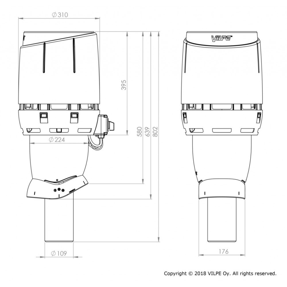 Размеры: Ø воздуховода 110 мм, внешний Ø 225 мм, высота над кровлей прибл. 500 мм.